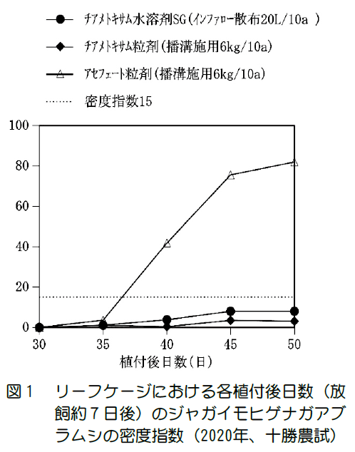 1)ジャガイモヒゲナガアブラムシに対するチアメトキサム水溶剤SG(100倍20L/10a)のインファロー散布の残効期間(密度指数*115以下を維持した期間)は、十勝農試で45~50日(平均:48日)、北見農試では30~46日(平均:40日)となった。この期間はアセフェート粒剤(6kg/10a)の播溝施用と比較して長く、チアメトキサム粒剤(6kg/10a)の播溝施用と比較してほぼ同等であったことから、長期間ジャガイモヒゲナガアブラムシの密度を抑制出来ると考えられた (図1)。また、北見農試における残効期間は、十勝農試と比較して年次間差が大きく、積算降水量が多い事例では残効期間が短くなる傾向であった。