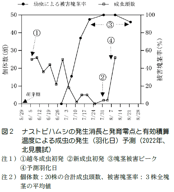 2)ナストビハムシの産卵から羽化までの発育零点*2は8.2℃、有効積算温度*3は663.7日度となった。また、成虫の産卵は萌芽直後に開始されると推測され、過去の報告よりも早かった(データ略)。幼虫の塊茎への食害は6月下旬から7月上旬に始まり、7月中旬頃から8月中旬にピークを迎えた(図2)。また、発育零点と有効積算温度による羽化日の予測は新成虫の初発時期とおおむね一致した。