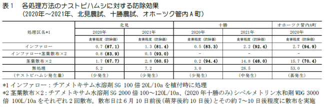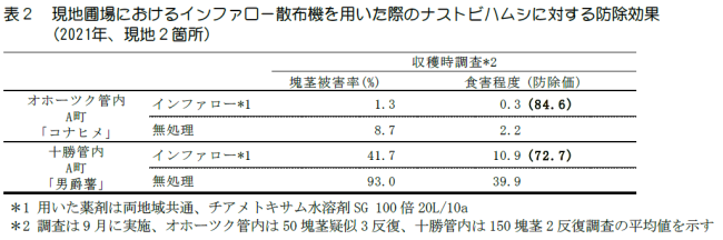 2)ナストビハムシの発生生態の解明とインファロー散布の防除効果の検証
