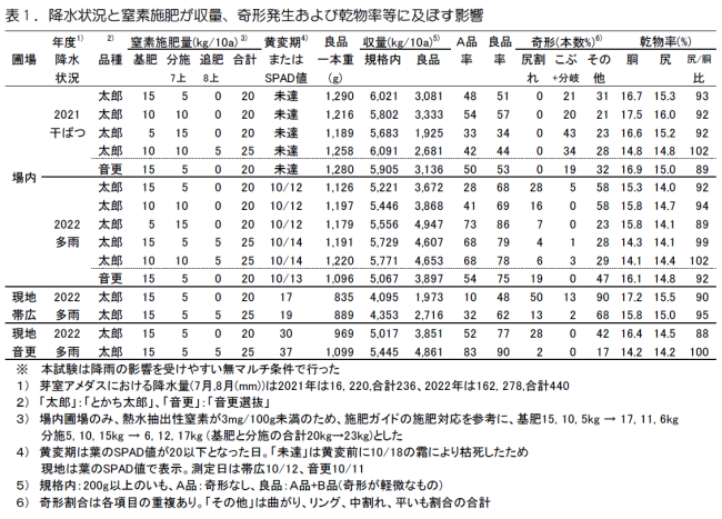 5)現地実証を行った2022年は多雨条件であり、追肥区(15-5-5)は施肥標準区(15-5-0)と比べ、奇形割合は低く、良品率は高い傾向であった。一方でいもの乾物率は低い傾向にあった(表1)。
