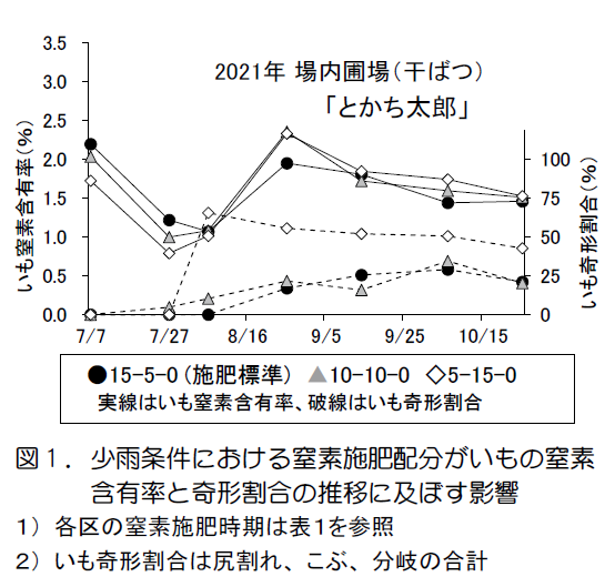 2)少雨であった2020年は各施肥処理区とも奇形の発生は少なかった(データ略)。7月に干ばつを生じた2021年は基肥窒素量を標準(15kg/10a)より減らした区でこぶの発生が多くなった(表1)。2021年は7月の干ばつで同上旬の分施が利用されず、7月下旬~8月上旬にいも窒素含有率が低下し、同時期からいもの奇形が発生した(図1)。そのため、干ばつへの対応として窒素基肥量は15kg/10aが適当であった。