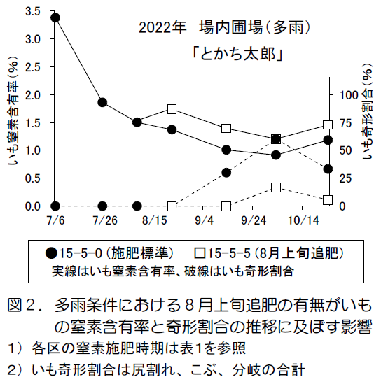 3)多雨や多灌水条件では施肥標準区(15-5-0)で尻割れが多発したが、8月上旬に窒素追肥を行った区や分施重点とした区では尻割れを抑制し、良品率を高めることができた(表1)。多雨条件では施肥窒素が溶脱し、施肥標準区では9月下旬~10月上旬にいも窒素含有率が低下し、同時期から奇形が多発した(図2)。そのため、多雨への対応として8月上旬に窒素5kg/10aの追肥を行うことが適当であった。一方、8月上旬の追肥は黄変期が2~4日遅れ、いもの乾物率を1~2ポイント低下させた(表1、一部データ略)。
