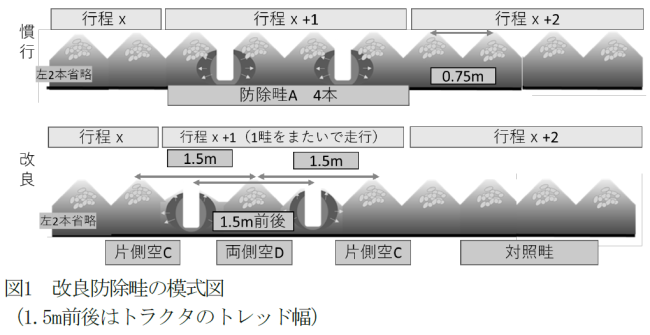2)防除通路は畦間カルチ等の除草機を活用して均すとその後の防除作業が安定しやすい。