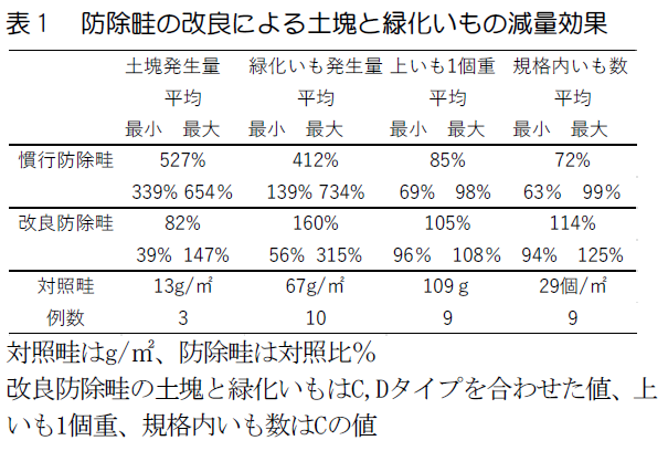 2)改良した防除畦の土塊発生量は、踏圧の影響を受けない畦(対照)と有意差はなく、慣行防除畦より減少した。一方、緑化いもの発生は慣行の防除畦に比べて減るが、茎の倒伏、畦のひび割れなどにより対照よりも増える場合があった(表1)。慣行の防除畦の収量は茎の損傷などにより対照に比べ低下した。これに対して、改良した防除畦は茎の損傷が少なく、上いも1個重と規格内いも数が増加することが多い(表1)。対照畦に比べ、慣行防除畦は減収し、改良した防除畦は多収となることから、畦数が減っても圃場全体の収量は慣行と同等と試算された(表2)。なお、防除畦の改良により広がった通路に雑草が発生することがあるが、除草剤茎葉処理の畦間処理により防除が可能であった。