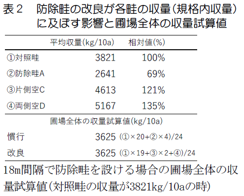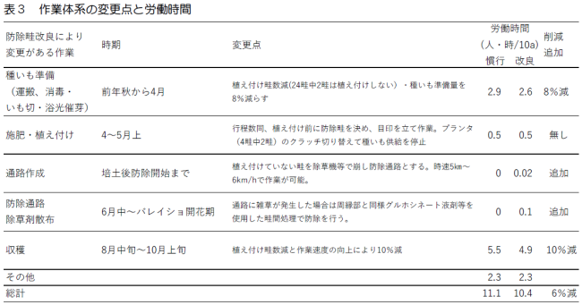 3)生産者圃場の収穫作業では防除畦の改良により土塊が多発する地点が減ったため、慣行の防除畦に比べて若干速い作業速度で収穫が行われた。作業速度の向上と収穫畦数の減少(18m間隔で防除畦を設置、条間0.75mの場合、慣行は24本、改良では2本の畦にバレイショを植えないため22本)により収穫時の投下労働時間は10%減ると試算された。現地における作業体系の変更点は表3に示したとおりであり、これらに伴うバレイショ生産の投下労働時間は慣行栽培を11.1時間/10aとした場合、約6%少ない10.4時間/10aと想定される。