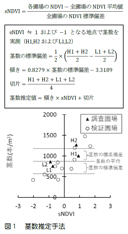 3)異なる年次・地域の比較では、茎数とsNDVIによる回帰式の傾きおよび切片は異なった。そのため、対象地域内の茎数の標準偏差および平均値を考慮して茎数を推定することとし、本手法では茎数の標準偏差から推定式の傾きを決定した。茎数の実測調査で対象地域内における茎数の標準偏差および平均値を算出し、推定式の傾きおよび切片を決定した(図1)。冬損等の障害がなく越冬前から起生期にかけて茎数は減少しないと仮定すると、茎数推定と起生期無追肥判定は越冬前に可能であり、越冬前に追肥要否を判断できなかった圃場のみで起生期にも実施する。