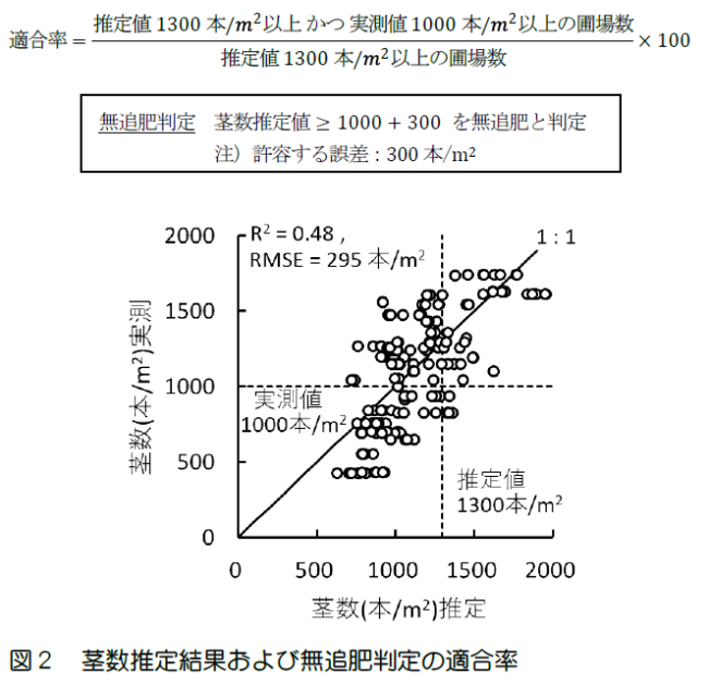 5)2021年越冬前、2022年起生期に現地圃場(A町、B町)で茎数を推定すると、RMSEは越冬前で286本/m2、起生期で300本/m2となった。無追肥判定すると、300本/m2の誤差を許容した際の適合率は90%であった(図2)。