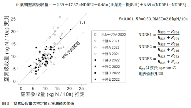 6)止葉期窒素吸収量はSentinel-2衛星画像から、NDRE2、止葉期と撮影日の日数差、NDRE1とNDRE3の差を用いて、年次・地帯・土壌型を問わず、15 kg N/10aまでの範囲で推定可能である(図3、推定誤差2.8 kg N/10a)。止葉期とその前後の窒素吸収量との比較から、止葉期の10日以内の衛星画像であれば止葉期窒素吸収量を推定可能であるため、追肥判断に活用できる。
