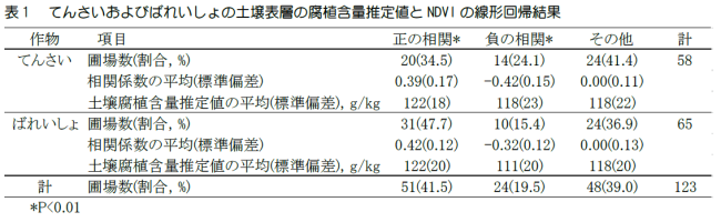 1)十勝管内鹿追町の黒ボク土地帯を対象に、てんさいおよびばれいしょ圃場123筆において、2016 年7 月の衛星画像から取得したNDVI と、同年4 月の裸地画像から推定した土壌腐植含量の相関関係を解析した結果、土壌腐植含量とNDVI に正の相関があった圃場が約4 割、負の相関があった圃場が約2 割、その他が4 割であった(表1)。負の相関があった圃場は作物生育が窒素肥沃度より排水性に影響を受ける圃場と判別でき、可変施肥の対象から除外するとともに、正の相関があった圃場は窒素肥沃度の高低に作物生育が影響を受けていると推定され可変施肥が有効な圃場として抽出した。