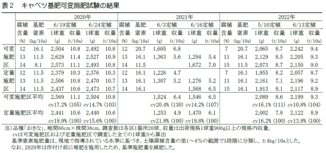 2)作物生育が土壌腐植含量に正の相関があるとして抽出した圃場において、施肥マップ対応型 4 畦作条施肥機を用いた一斉収穫向け移植キャベツの基肥可変施肥試験を実施した。基準施肥量は、現地で指導されている水準に基づき、土壌腐植含量の差 1~4%の範囲で 3 段階に分類し、±40kg/10a とした(図 1)。その結果、土壌腐植含量が少ないと推定され増肥した調査点では、1球重の増加が確認できた。一方、土壌腐植含量が多いと推定され減肥した調査点では、1 球重の低下は認められず、定量施肥区と同等の収量を維持しつつ施肥量削減が可能であった。供試した 3 カ年計 6 作型全てで可変施肥区は定量施肥区に対し規格内収量が 3%以上の増加を示すとともに、1 球重の変動係数(CV)は小さくなった(表 2)。施肥マップ対応型4畦作条施肥機は作業幅が 2.4~3.0m で、細かなメッシュサイズの施肥マップに対応が可能となることから、作条施肥を基本とする多くの作物や、小区画で栽培する作物の可変施肥に対応できる。