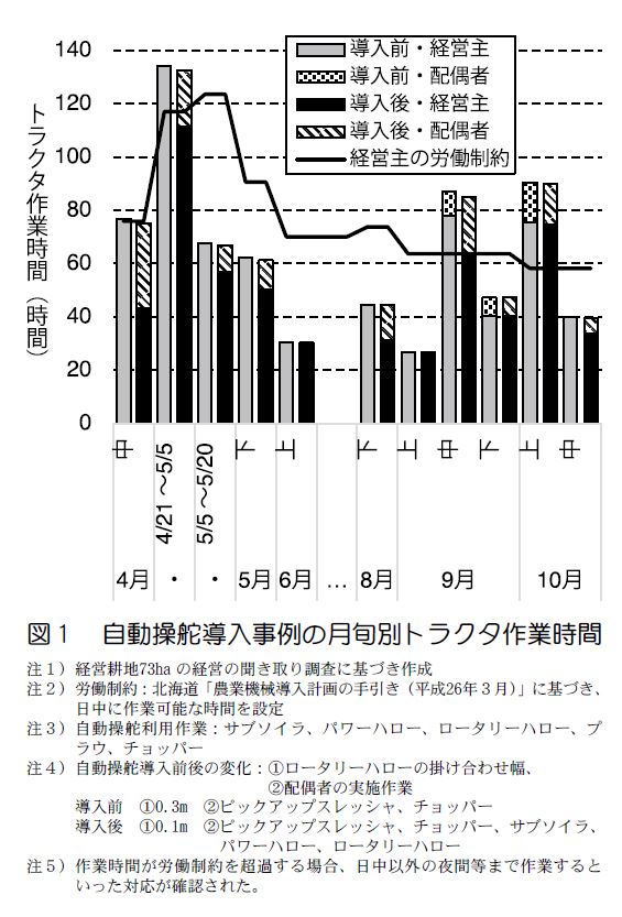 1)自動操舵の導入効果として、経営主の配偶者等の未熟練者が新たなOPとして従事するといったOPの創出、掛け合わせ幅の減少等の投下労働時間の低減、心身の負担軽減等が確認された(データ略)。これらのうちOP創出効果に注目すると、畑作4品70ha規模経営では、配偶者がOP従事できるようになることで、4月~5月や9月の繁忙期のOP作業を分担でき(図1)、労働集約的かつ高収益な作物であるてんさいや生食・加工用ばれいしょ等の作付面積を維持した大規模化に対応できていた(データ略)。