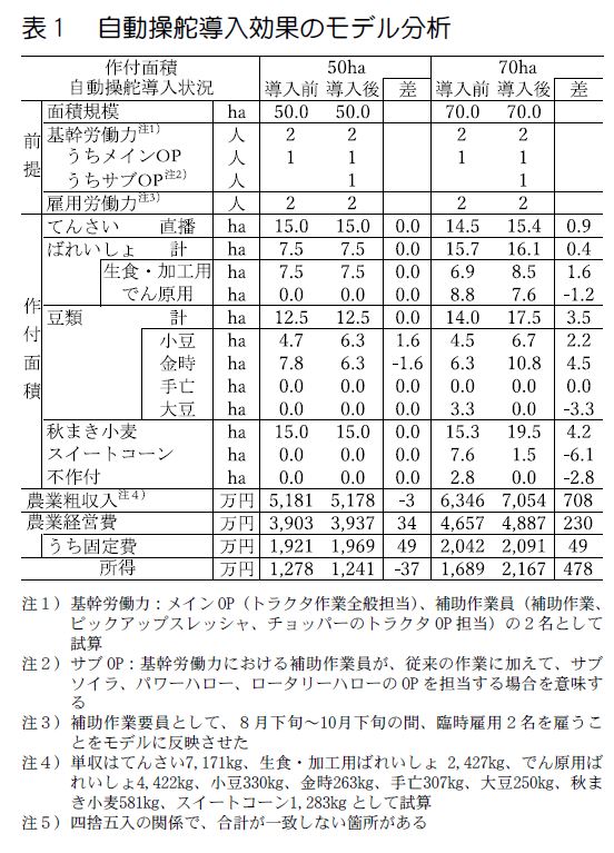 2)保有労働力2名・畑作4品の経営で自動操舵1台導入を想定したモデル分析の結果、導入前に比べ50haまでは作付構成に対するOP創出の影響は小さかったが、導入後は規模拡大してもてんさい、生食用ばれいしょ、金時の作付面積の維持が可能となった(表1)。また70haまで拡大すると、未導入では不作付の面積が生じるのに対し導入後は発生せず、所得が478万円増加した。自動操舵の利用下限面積は56.7haであり、それ以下では所得に対する効果は得られなかった。作業負担の軽減効果は経営耕地面積規模によらず高く評価されていた(データ略)。