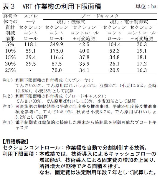 4)畑作経営においてセクションコントロール対応作業機を導入する場合、スプレーヤの利用下限面積は経営全体での資材10%削減で59.1ha、資材20%削減で29.5haとなった(表3)。機械式ブロードキャスタの更新に伴う導入時の利用下限面積は、資材25%削減で70haとなるが、既往の成果に基づく可変施肥の増収効果を加えて試算すると、34.1haとなった。自動操舵システム保有の畑作経営において電子制御式ブロードキャスタの更新に伴う導入時の利用下限面積は資材25%削減で20.9haとなった。
