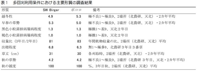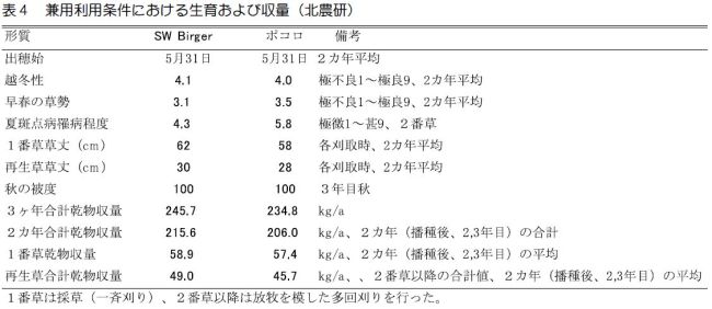 5)耐病性:2つの雪腐病罹病程度は同程度であった(表1)。兼用利用における、夏斑点病の罹病程度は低い(表4)。
