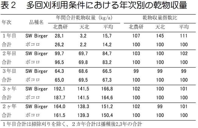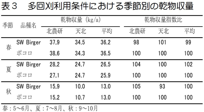 3)収量性:3カ年(1-3年目)合計、2カ年(播種後2、3年目)合計の乾物収量は、いずれも同程度である(表2)。年次別の合計乾物収量は、1年目が多い傾向にあるが、2年目はやや多いもしくは同程度、3年目はやや少ないか同程度である。季節別の乾物収量はいずれも同程度である(表3)。