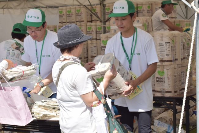 よつ葉の乳製品やソフトクリーム、ピザも販売。大好評のトイレットペーパー交換会では、1Lの牛乳空パック5枚と再生トイレットペーパー1ロールを交換します。※お1人様8ロールまで