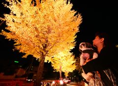町内の会社員阿部卓也さん(53)は妻千穂さん(50)、三女で共栄中学校2年生の恵愛(めえあ)さん(13)、愛犬のポッコくん(5)と連れだって来場。一家は「去年から今年はライトアップが始まったらすぐに行こうと決めていた。愛犬と一緒にきれいなイチョウを撮影することができて満足」と喜んでいた。