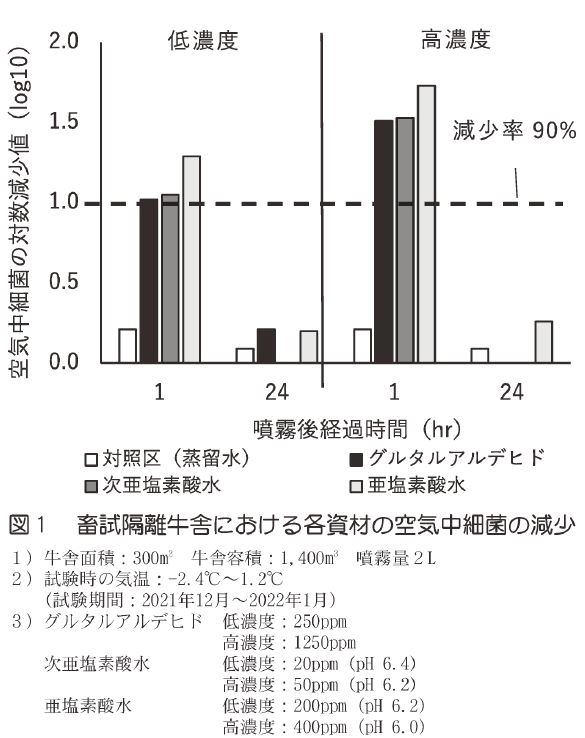 1)冬季の牛舎において従来から使用されているグルタルアルデヒドおよび代替資材として安全性の高い次亜塩素酸水と亜塩素酸水の煙霧消毒を実施し、空気中細菌に対する殺菌効果を検証する。