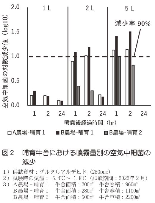 冬季における牛舎の呼吸器病対策として、グルタルアルデヒドを微細粒子状にして噴霧する煙霧消毒を実施している。しかし、グルタルアルデヒドは毒性が強く、煙霧消毒のような空間消毒では、人畜に安全な代替資材が求められている。また、消毒剤は一般的に低温下で効果が減弱するが、冬季における煙霧消毒の有効性については十分な検証がなされていない。