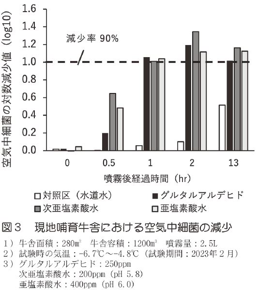 3)空気中粒子数の推移から煙霧消毒により噴霧された除菌・消毒剤は、1~2時間後に空気中から消失することが確認された(データ略)。試験を実施した7つの哺育牛舎のうち、グルタルアルデヒドおよび次亜塩素酸水は5つの牛舎で、亜塩素酸水は6つの牛舎で噴霧終了1~2時間後に空気中細菌数が減少し殺菌効果が認められたことから、低温下の哺育牛舎においても次亜塩素酸水および亜塩素酸水はグルタルアルデヒドと同等の殺菌効果が認められた(図3)。