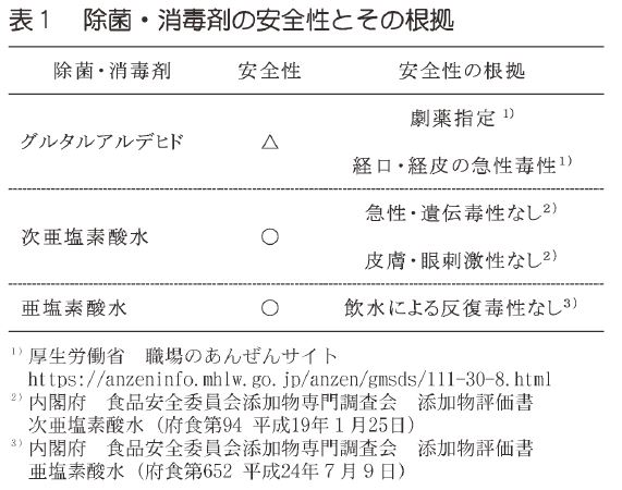 安全性試験等のデータから、本試験で用いた除菌・消毒剤はグルタルアルデヒドと比較し、安全性が高く、次亜塩素酸水および亜塩素酸水は煙霧消毒における代替除菌剤として有効であることが確認された(表1)。