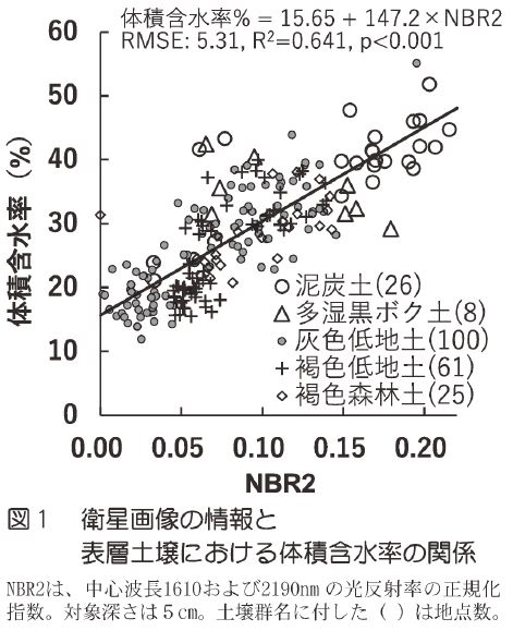 1)(1)表層土壌(深さ5cm)の水分量は、土壌型に関係なく、裸地条件における短波長赤外光反射率の正規化指数(NBR2)と直線的な関係が認められた(図1)。