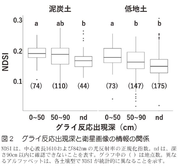 (2)水田転換畑地域において、グライ反応の出現深さが異なる地点群間では、裸地条件での短波長赤外光と近赤外光の反射率の正規化指数(NDSI)は統計的に異なった(図2)。