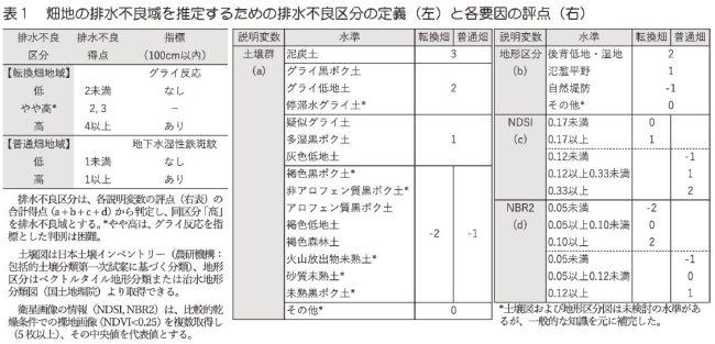 2)(1)データ分析の結果、上記リモセン指標や既存の地理情報は、排水不良区分の推定に有効であった(データ省略)。この結果や既往知見を参考に、地域の地理的条件から排水不良区分を簡易に推定するための評点を各要因に割り振り、合計得点により排水不良域を推定する手法を開発した(表1)。