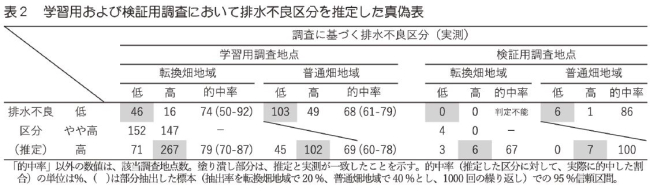 3)(1)推定した排水不良区分の的中率は、検証用地点を含め約7~8割であった(表2)。また、地理的条件から排水不良と推定された圃場において、圃場内で相対的にNDVI(作物生育良の目安となるリモセン指標)が低い区域は、相対的に排水性が劣る事例が多いことを土壌断面調査で確認した(データ省略)。