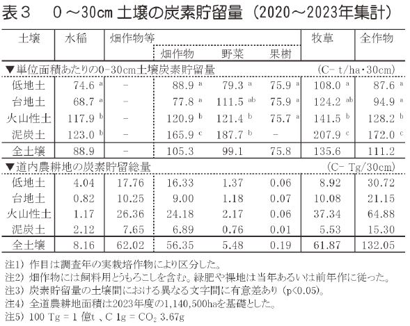 4)道内耕地30cm深の土壌炭素貯留量は全作目・全土壌平均で111.2t/haであり、牧草を除いて作目間差は小さく土壌間差が大きかった(泥炭土172>火山性土128>台地土95≒低地土88)(表3)。