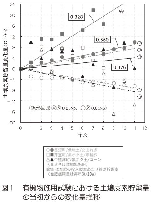 7)有機物無施用での土壌炭素貯留量は、低地土と多腐植の黒ボク土で漸減し、少腐植の黒ボク土で微増した。緑肥や残渣よりC/N比の高い牛ふん麦稈堆肥では炭素貯留の効率が特に低地土で高かった(図1)。
