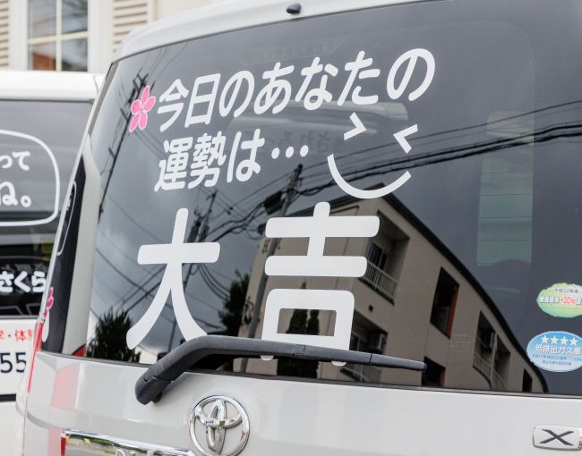 実はこの車、株式会社・花が営む社会参加型デイサービス施設「さくら大学」の送迎車。2020年には、同施設の高齢者によるヒップホップダンスチームが全国大会に出場したことでも話題になった。「100歳になっても大丈夫!」というコンセプトの下、ユニークな試みを実施。「大学」にちなんで時間割を組んだり、部活動を行ったり、仕事をして施設内で使える通貨を稼いだりなど、随所に遊び心が感じられる。