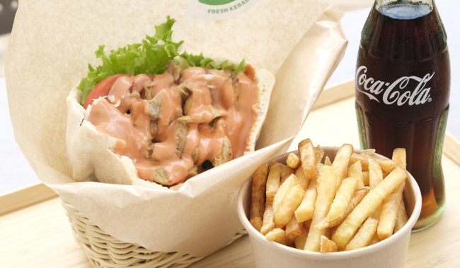 移動販売「トカチケバブ」の味を楽しめる。独自のスパイスで味付けた鶏肉を回転させて焼き、薄くそぎ落とした本格的な「ドネル製法」がおいしさの秘密。ピタパンにあふれるほどの具材を挟み、ボリューム満点で提供する。無休。