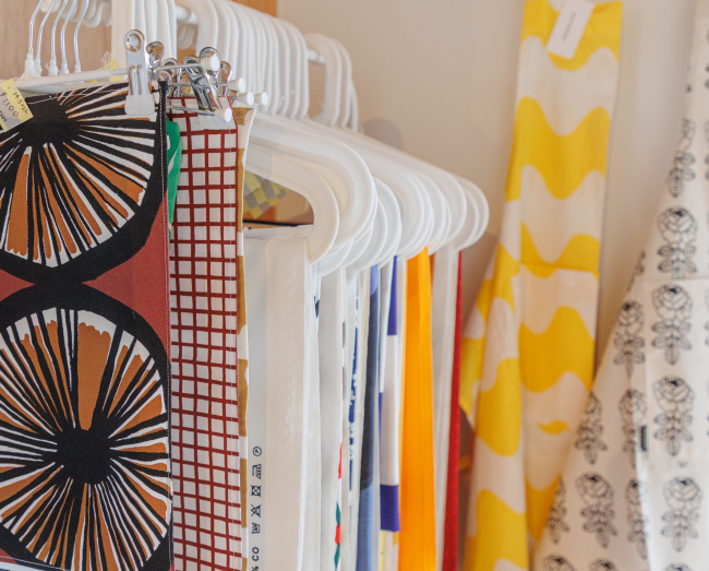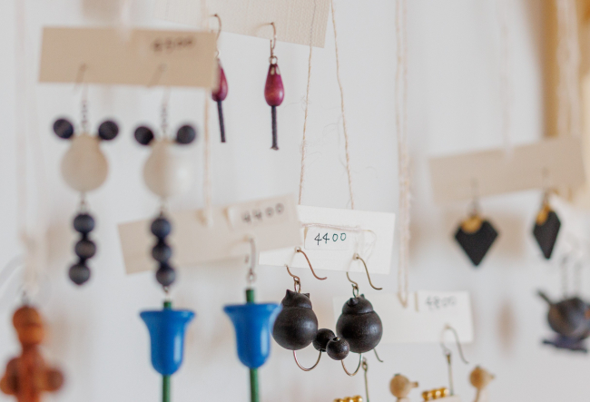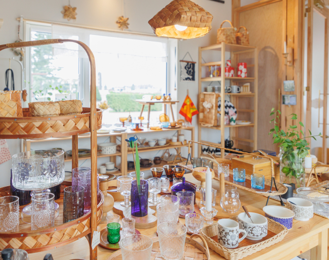 古民家を改築した建物の一角で、ひっそり営む北欧雑貨の店。新しい木の香りが漂う居心地のいい店内に、個性的なデザインのグラスや布地、アクセサリーなどが並ぶ。