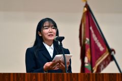 • 式典で祝辞を述べる佐野校長(金野和彦撮影)