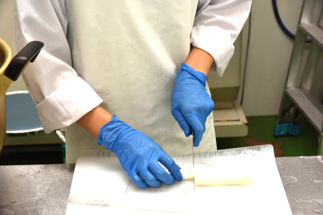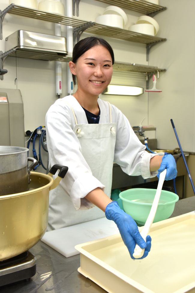 帯広農業高等学校3年生の高森喜代さんは、チーズを食べるのも作るのも大好き。その愛が高じ、校内の施設を利用して自主的にチーズづくりを行うほどだ。学生らしくはつらつとした印象の高森さんだが、ひとたび白衣に身を包めば、”職人“へ。迷いのない動きでテキパキと作業をこなす。