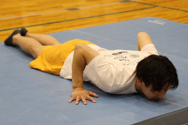 大人は腕を曲げて床に手を置き、うつぶせになる。