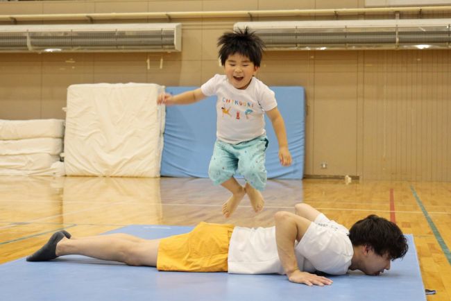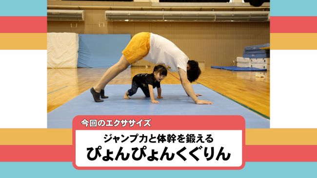 このエクササイズでは、ジャンプ力と床をはう動きで子どもの体幹を鍛える。大人も腕立てに近い動きで胸回りや肩、腕の筋肉に効果的な運動になる。