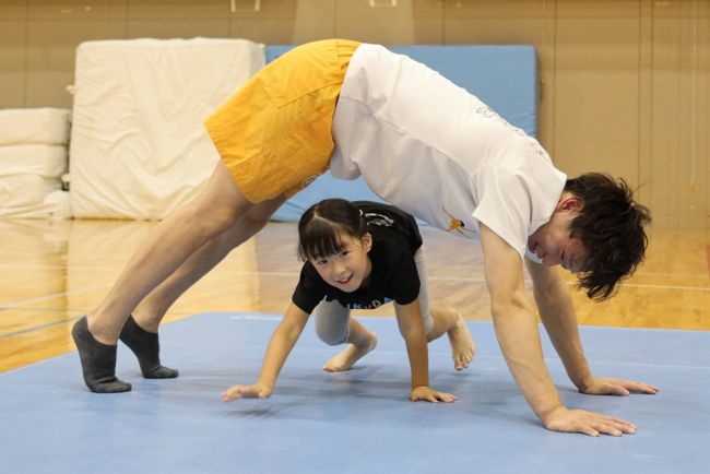 大人は手と膝を床につけて四つんばいの姿勢になる。子どもは大人の背中に手をついて馬跳びをしてから、体の下をくぐってみよう。馬跳びは小学校で行う跳び箱の開脚跳びにも応用できる。