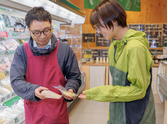 十勝の特産品などが集まるとかちむら産直市場。「ピザに欠かせないチーズを選ぶならここ!」とアサミが訪れた。早速店長の松本大輔さんに案内してもらい、チーズ売り場へ。「チーズだけで約50種類。ラクレットやモッツァレラなどが人気」と松本さん。ほかにも黒豚ロースハムに燻製マヨとピザのアクセントになる食材もゲット。豪華なピザができる予感に胸が高鳴る。