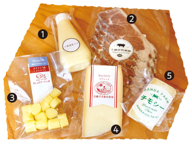 (1)十勝冷燻工房(中札内)の〈燻製マヨ〉750円(2)雪あかり(鹿追)の〈十勝放牧黒豚無添加ロースハム〉900円(3)あしょろチーズ工房(足寄)の〈あしょろ熟モッツァレラ「ころ」〉514円(4)共働学舎新得農場(新得)の〈ラクレット〉1,188円(5)半田ファーム(大樹)の〈チモシー〉778円