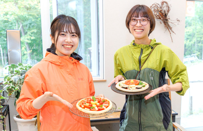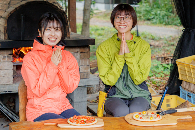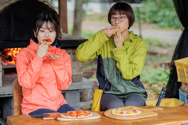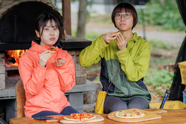 石窯で焼き上げたピザは、生地がサクサク、チーズはトロトロの仕上がり。早速ほお張った2人は「野菜が甘くて歯ごたえがいい!」「チーズのコクもすごい」と大絶賛。「十勝の食材を使えば、ぜいたくなピザができるんだね」とアサミが満足そうに話すと、「十勝の自然も最高!外で食べると一層おいしい」と、ミサキも声をそろえる。ピザづくりの体験を通じて、チーズをはじめとする十勝食材の素晴らしさを改めて実感する2人だった。