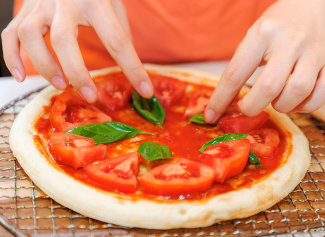 炊事場で食材をカットし、飾り付けへ。アサミ作のピザは中央にトマトの輪切りをあしらい、かわいらしく仕上がった。「題して『花畑』」と、アサミはにっこり。一方ミサキのピザは食材を積み上げた個性的なルックスに。「タイトルは…『サグラダファミリア』!」。大きなポテンシャルを感じる(?)ピザが出来上がった。