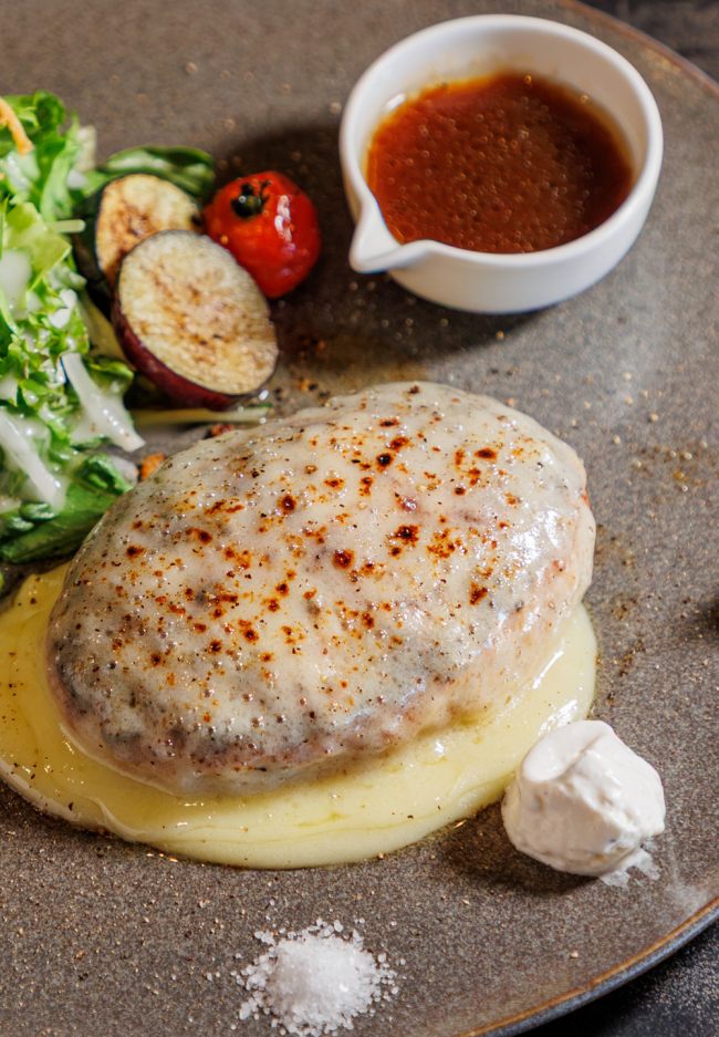 看板メニューの〈チーズハンバーグ〉は、数種類のスパイスを肉に混ぜ合わせ、風味豊かな味わいに。一度表面を焼いてから、オーブンで中までじっくりと焼き上げる。ハンバーグの上からトロッとかかるミックスチーズが、あふれる肉汁と相性抜群。特製ソース、塩、ワサビ、クリームをお好みでつけてどうぞ。