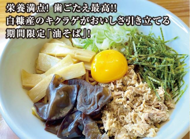 人気のラーメン店「純水 春採本店」から期間限定の新メニュー「油そば」が登場。具材で最も目を引くのが白糠で生産される生キクラゲ「ハルカなる大地のキクラゲ」。自然に優しく、豊かなおいしさのために生産工程にこだわり、プリプリとした食感とビタミン、鉄分、カルシウムなどを豊富に含むのが特徴。この油そばのために仕上げた醤油ダレは全体のバランスを考え試行錯誤を重ねた自信作。風味豊かな岩井の純正黒胡麻油も香る渾身の一杯。このほかどんぶりにはメンマ、ネギ、刻みのり、ほぐしチャーシュー、卵黄などが乗りボリュームも満点、昨年8月の販売開始以来同点の大人気メニューになっている。提供期間は白糠産キクラゲの在庫が無くなり次第終了になります。どうぞお早めに。