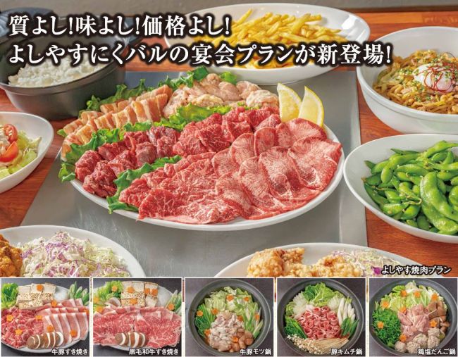 昼はコスパ抜群のランチメニュー、夜は大満足のお肉メニューでお酒が進む『よしやす食堂/よしやすにくバル』から、おいしくて、みんなが満足する宴会プランが新登場。