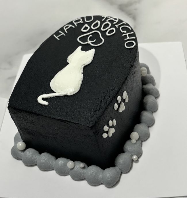 今回我が家の黒猫「ハル」をモチーフにしたケーキをオーダーすると、想像以上のすてきなデザインに仕上がり、食べずに飾っておきたいくらい感動!インパクトがある黒のコーティングは、食べられる炭を使っています。サイドの肉球が、またキュート。見た目とギャップがある「王道ショートケーキ」の味で、無心で一気に食べてしまうくらいおいしい!小さなお子さんも安心して召し上がれます。