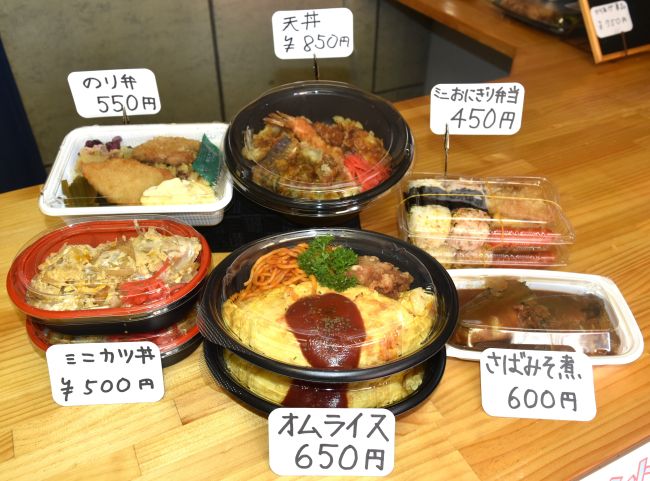 のり弁、オムライス、天丼などの弁当から、さば味噌や煮物、サラダなどの総菜まで幅広くご用意しています。弁当は450円~、総菜は300円~。昼ご飯や夕食のもう一品として、買い物帰りや散歩のついでにお立ち寄りください♪