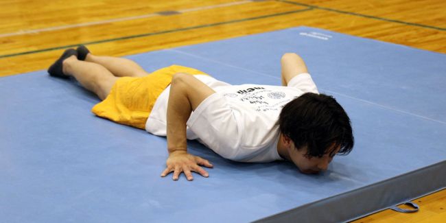 大人は腕を曲げて床に手を置き、うつぶせになる。
