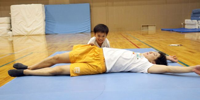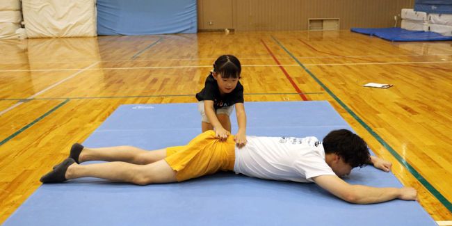 子どもは、うつぶせの大人を押したり引っ張ったりして、あおむけにひっくり返す。大人は、すぐにひっくり返されないように全身に力を入れて耐えましょう。